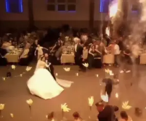At first, it was thought that fireworks sparked the fire, but the groom, Revan, thinks it started in the ceiling somehow. He told Sky News, “It could be a short circuit; I don’t know.” But the ceiling caught fire.
