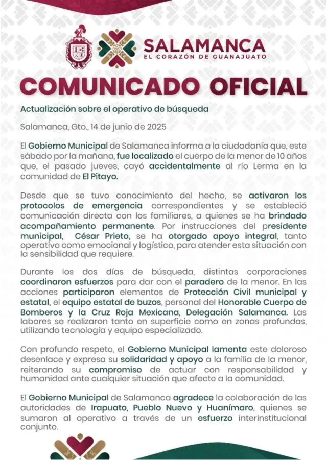 The Salamanca Municipal Government confirmed the unfortunate news in an official statement: “This Saturday morning, the body of a 10-year-old girl who accidentally fell into the Lerma River in the community of Pitayo last Thursday was found.”