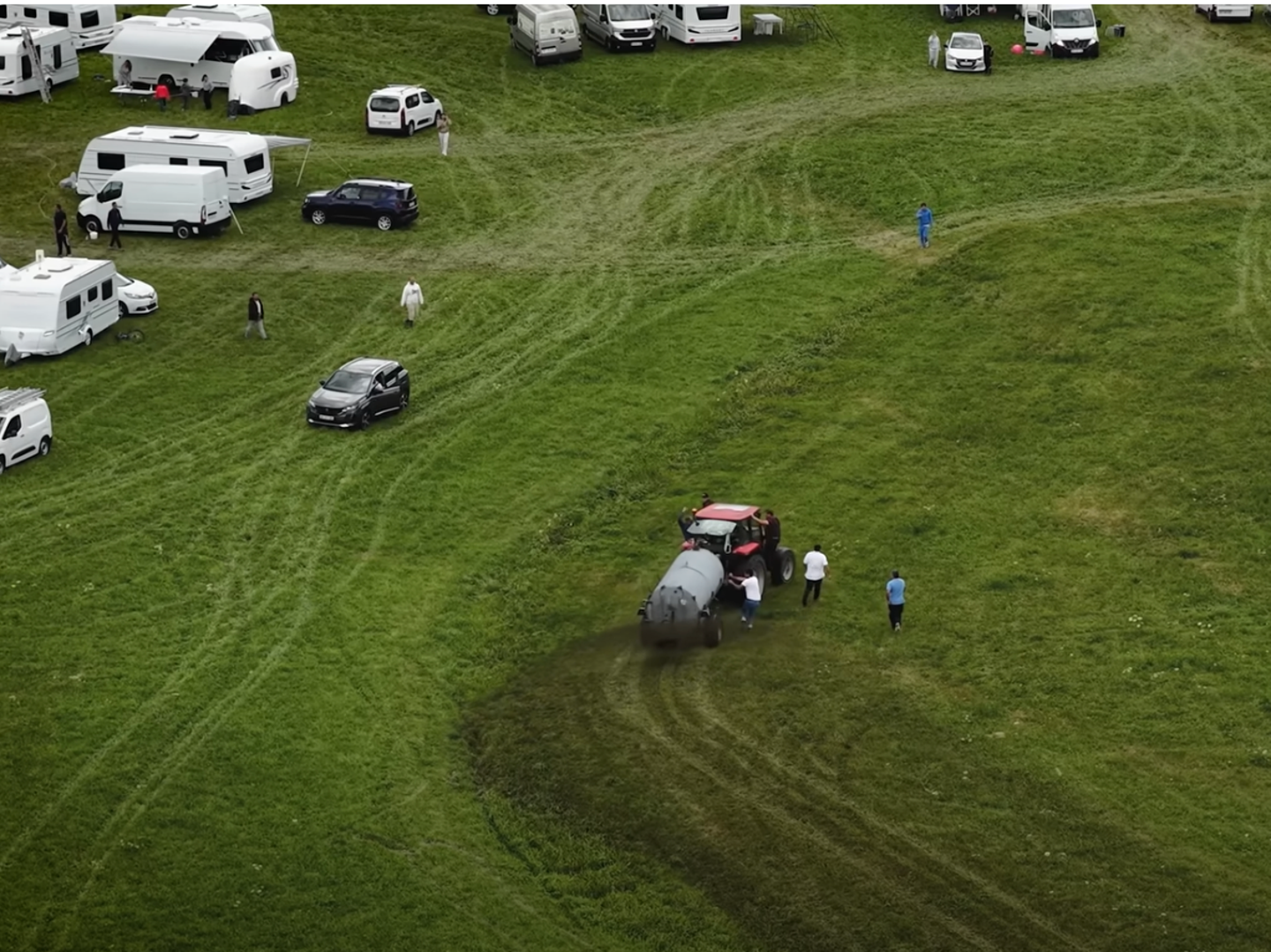 Said to have taken place earlier this summer, the clip shows a number of tractors driving onto the field, approaching the collection of caravans.