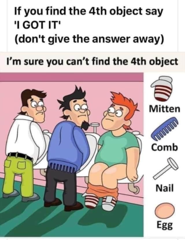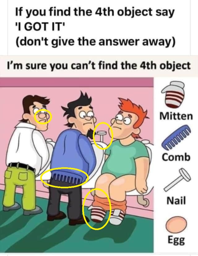 At first glance, this image presents a typical scene—three men standing in a public restroom, with one man seated on a toilet. But there’s a twist: the puzzle encourages you to find the elusive “fourth object” among a list of items. The objects shown—a mitten, comb, nail, and egg—seem straightforward, but can you find the fourth item that’s been cleverly hidden?