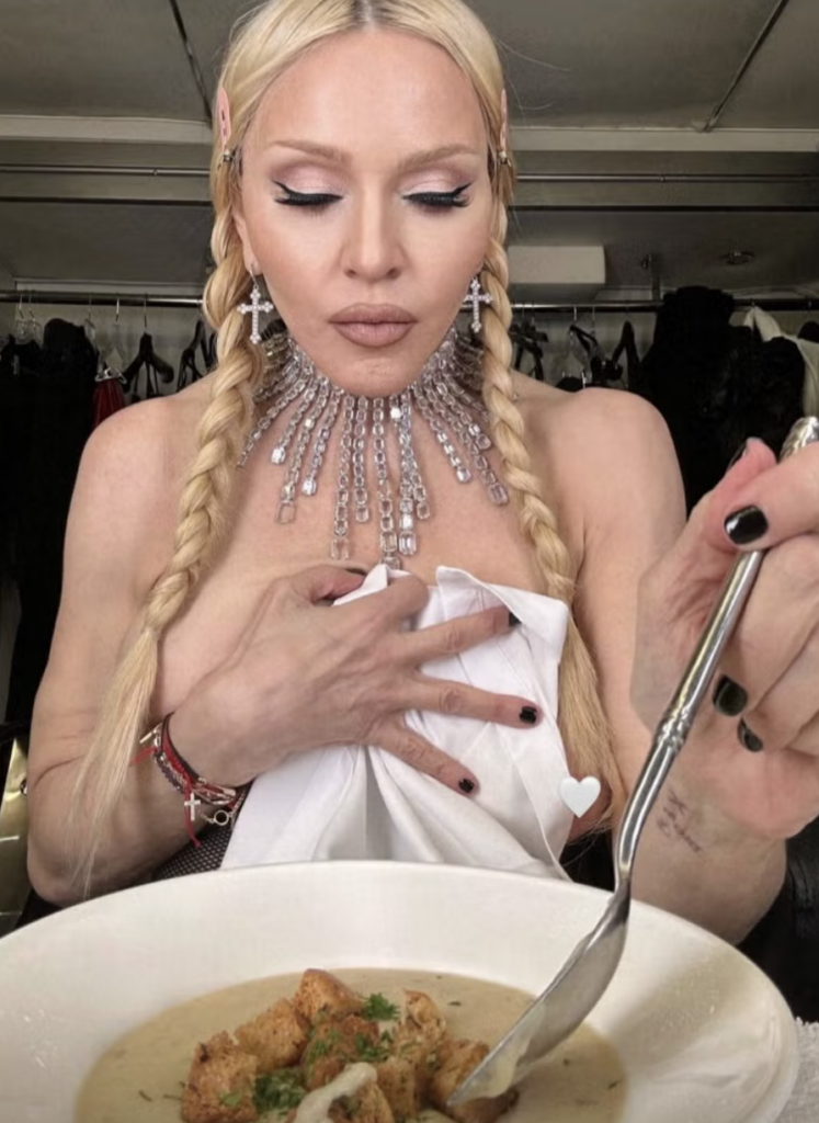 The final image shows Madonna leaning forward, about to take a spoonful.