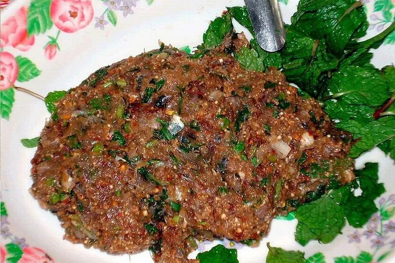 Koi pla is a dish made of raw fish ground with spices and limes. It is eaten by millions of Thais, especially in Isaan.